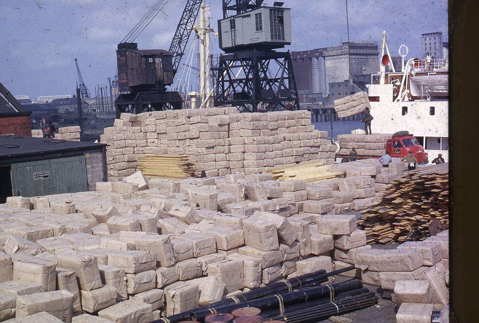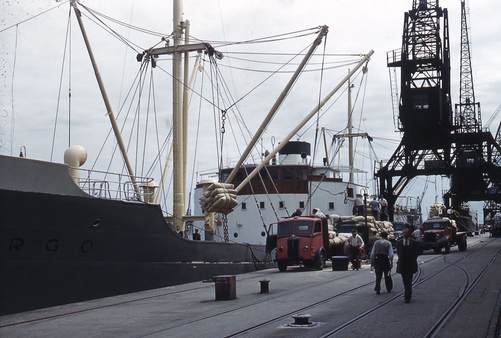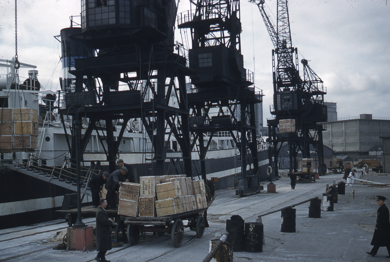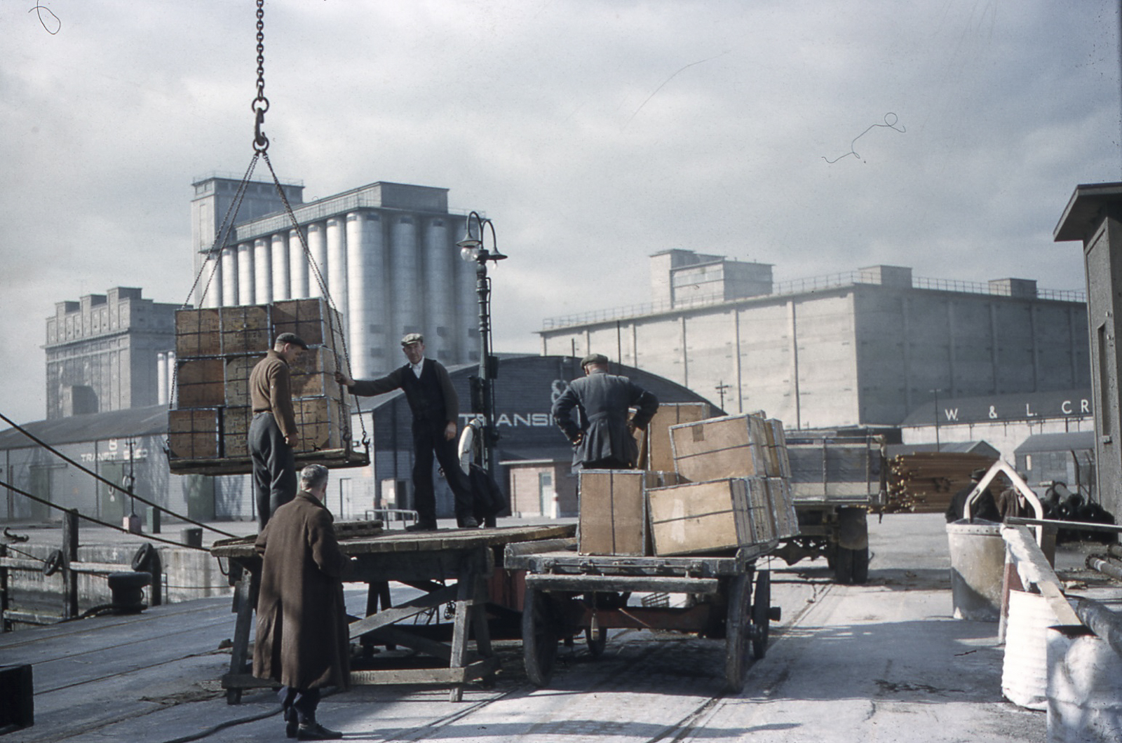 Dublin Port Archive preserves a collection of over 3,500 colour slides, dating between the 1950s and 1970s. The main topics depicted are port operations and shipping. They depict an era that is long gone, starting to disappear with the invention of the container by Malcolm McLean. The container meant the standardisation of shipping and changed the port environment forever. Dockers and their expertise in handling all types of cargo manually, filling or emptying a ship hold manually and in the most efficient way, were no longer needed. The Dublin docks, that ran down both sides of the river from the Custom House to Alexandra Basin, were no longer suitable for the massive container ships, and the port was confined to its current location.